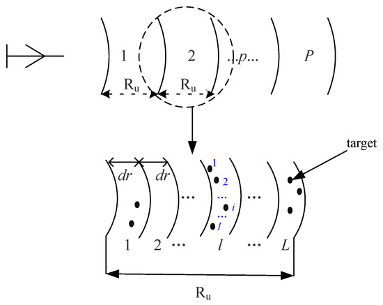 is the transmit steering vector for the nth transmit element. It can be seen from Equation (24) that the second term of each range region is different. Therefore, we can separate the ambiguous echoes by utilizing the second term. The first term can be compensated by the following compensation function.
