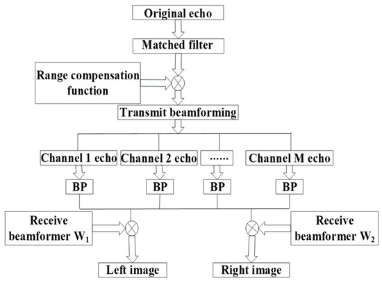 Figure 5. After matched filtering, the signal is processed by range compensation and transmit beamforming to resolve the range ambiguous echoes into several unambiguous parts. Then, by performing BP on the echoes without range ambiguity received by each channel, we will have the image with left and right ambiguity. Next, the echoes after performing BP are processed by two receive beamformers, respectively. Finally, we can obtain the unambiguous images of the two sides.