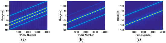 Figure 8a,b, respectively. It is apparent that the proposed range ambiguity resolution approach has effectively resolved the range ambiguous echoes into two unambiguous parts. In