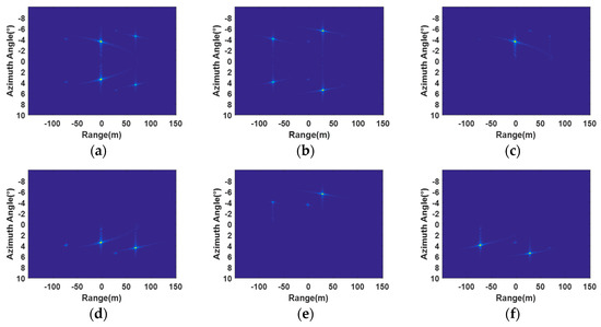 Figure 8a, it can be seen that the energy of the targets in the first range region is well focused, while that in the second range region is suppressed. In addition, the energy of target 1, target 2, and target 3 is distributed on both the left and right sides of the scene because of left–right ambiguity. In