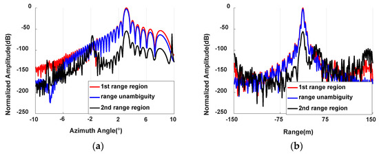 Figure 9a,b show the amplitude of the 150th range gate and the amplitude of the 164th azimuth gate, respectively. Target 1 is in the 150th gate and the 164th azimuth gate of the first range region. Thus, the actual energy of target 1 should be in the first range region. However, the energy of target 1 is distributed in the first and the second range regions due to range ambiguity. The blue line represents the amplitude of target 1 without range ambiguity. The red line and black line denote the amplitude of the first range region and the second range region after performing range ambiguity resolution, respectively. As can be seen from