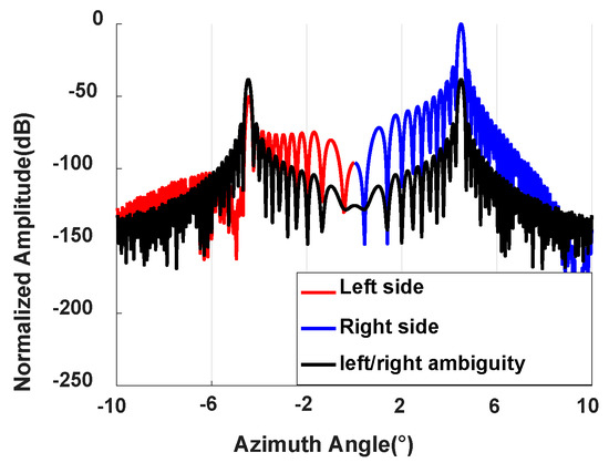 Figure 10 that the peak of the red line is lower than that of the blue line, and the gap is greater than 50 dB. This shows that the left–right ambiguity resolution proposed in this paper can effectively suppress the left–right ambiguous echoes.