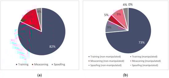 Figure 1a shows the relative proportions among all three (simulated, meaconing, and spoofing) datasets and (b) basic characteristics of each dataset (ratio between manipulated and non-manipulated GNSS records).