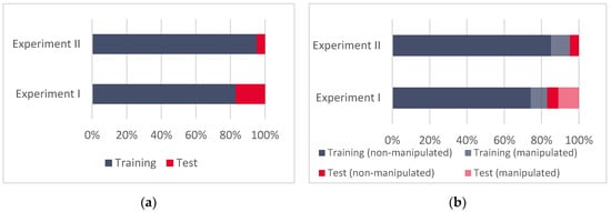 (a) Training and test datasets for Experiment I and Experiment II, and (b) the relative ratios of manipulated and non-manipulated GNSS records in datasets.