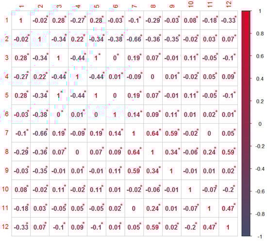 The matrix of correlation coefficients in Figure 4 shows the partial correlations among the variables given in Table 1. Hence, the numerical value indicating the rows and the columns of the matrix corresponds to the numerical values of the “variable number” as presented in Table 1 and the value presented the matrix represents the partial correlations for corresponding variables.