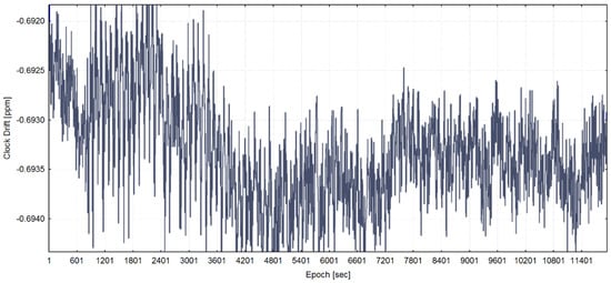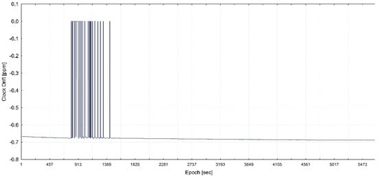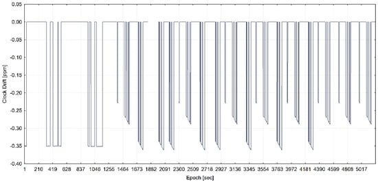 The training of the model has been performed with the use of all statistically significant variables for each of three programmed receiver’s clock divergence values. In Figure 5, Figure 6, and Figure 7, the receiver clock drift is shown for each of clock divergence values (5 ns/s, 1 ns/s, and 0.3 ns/s, respectively).