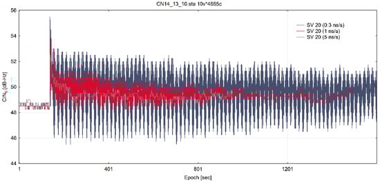 In Figure 9, the C/N0 ratio of G20 satellite is shown superimposed for all three training datasets (three clock divergence values). The start of the spoofing signal emission is visible on the graph as a jump in dB-Hz value 120 s into the test.
