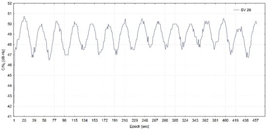 The C/N0 density ratio for a G20 satellite (SV 20) from a real-world meaconing dataset is shown in Figure 10.