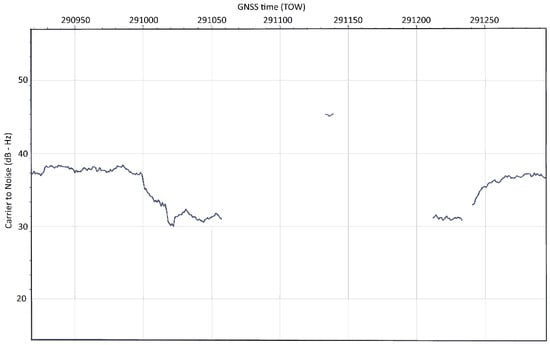 In Figure 11 and Figure 12, the respective C/N0 and pseudorange time plots from the real-word spoofing dataset show spoofed GPS PRN18 that has been acquired for a short time after reacquisition (preceded by the forced signal outage) and tracked for the short time (six seconds) before it has been removed by the RAIM FDE algorithm.