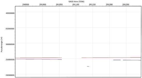 Pseudorange time plot of the spoofed GPS PRN18 (in blue) tracked between TOWs 291133 and TOWs 291139 (compared to consistent pseudorange of true GPS PRN25 in red).