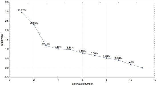The results of the PCA analysis indicated 10 principal components that are shown, with the successive eigenvalues on the x-axis, in Figure 15. The first component accounts for almost 37% of the manipulated signal indication variations, the second for 21%, and the third for 11%. Lastly, the tenth component captures only 1.7% of the variations. Considering this, we wanted to explore which observables contributed to these factors. In the factor coordinates matrix, one can see the relation between the components (columns) and observables used to build the model (rows). This overview indicates that the first component is built mainly based on the C/N0, pseudorange, full carrier phase, and code variance variables (the respective eigenvalue is most correlated with these variables). Furthermore, all of the above-mentioned observables have high (and negative) correlations, with the exception of C/N0.