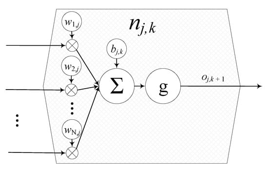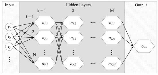An artificial neural network consists of a high number of neurons n which are interconnected over a certain number M of layers. The layers between the input and the output layer are the hidden layers and determine the complexity of the functions which they approximate (see Figure 1 and Figure 2). Then, the connection between a neuron i of the layer with another neuron j of the next layer k is weighted with a weight before being added to the other weighted inputs of the neuron. Afterwards, each neuron adds a bias . The output of the neuron j in the layer k is calculated by the activation function . This can be written as follows [19]: