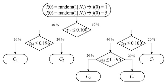 The random forest consists of multiple trained trees. These trees have multiple splits where the data gets separated into two similar sized groups. Possible criteria for the split are the gini index or the entropy. See Figure 3 for a simple example with five clusters to . In each branch, we have a simple condition based on one TDoA measurement. If one would use only one tree, a problem would arise. If we do not have any data about the root node or any node along the way, the tree cannot make a prediction, or at least, it can only be used to analyse a subset of clusters. To work around this problem, we do not train one tree but a forest of trees. All trees are trained on different subsets of the training data and use different splits to distinguish between the clusters. As well as reducing our reliance on each TDoA measurement, the ensemble of trees also reduces the bias that a single trained tree has. Another advantage of the random forest is that it is very easy to interpret as we can look into the splitting points and see how the clusters get separated.