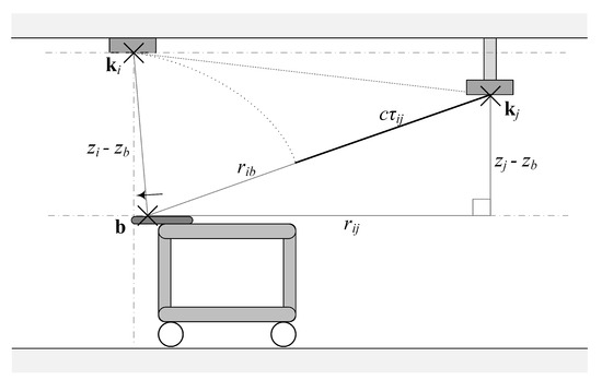 where c is the sound velocity and the starting time of the signal transmission. Then, having another one of those anchors with index j at position , one can calculate the TDoA as formulated in Equation (3), which does not depend on the sending time.