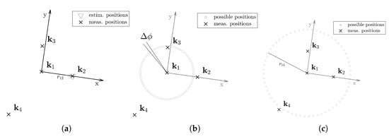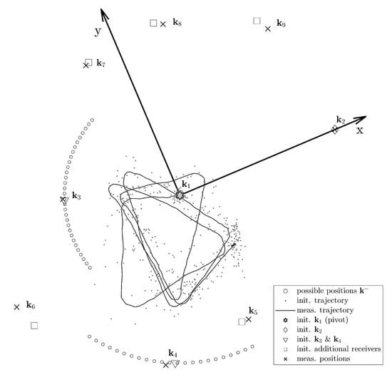 To initialize the trajectory, we randomly choose a configuration from the possible spaces for each of the waypoints on the trajectory and estimate the sender positions with the closed-form solution. Figure 10 gives an example of the initialization results. We choose a central anchor as the origin and a randomly selected encompassing anchor , through which we define the positive x-axis. The position estimation of the next anchors and is selected from the reduced solution sub-space. We estimate the initial positions of these latter two anchors from the average coordinates in the polar system.