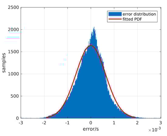 First, we have to determine the error level of the TDOA localization system before starting the simulation. Therefore, we estimate the theoretically expected TDoA values using the real trajectories recorded by a Motion Capture system, which has submillimeter accuracy and precision, and the true anchor positions. We compared the TDoA measurements and the expected values in 200,138 TDoA measurements to estimate the measurement errors (see Figure 11). Fitting the error distribution into the Gaussian distribution, we obtained a Gaussian distribution with and . Since , we regard the offset of the error distribution to be 0.