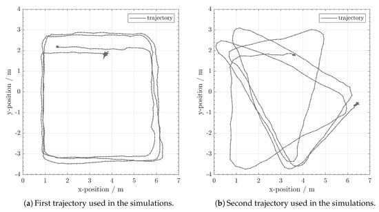 The two trajectories shown in (a) and (b) respectively are used in the simulations to emulate a moving beacon.