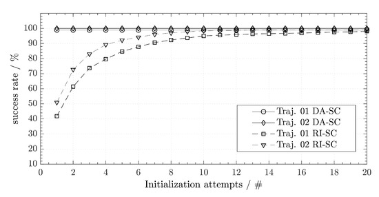 Since direction adjudgment is a deterministic process, we evaluate only its single success rate from the first attempt. Table 1 gives the success rate at the first attempt between direction adjudgment (DA-SC) and random initialization (RI-SC) for the two different trajectories.