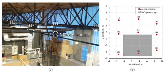 The anchors in the Hangar are mounted in a height of appoximately above the concrete floor to steel beam girders and powered permanently by wire. We measured the real positions of the anchors with a Total Station Topcon GPT-8203A for reference. A part of the anchor set-up is shown in Figure 16a for illustration. We use the Motion Capture (MoCap) system MotionAnalysis Cortex with Raptor-E cameras to record the true trajectory with sub-millimeter precision. The MoCap system only provides reliable positions in the area between the cameras, which results in a limited coverage area that is considerably smaller than the one of ASSIST. Figure 16b is the top-view of the Hangar experimental area with anchor positions, where the grey area indicates the MoCap coverage.