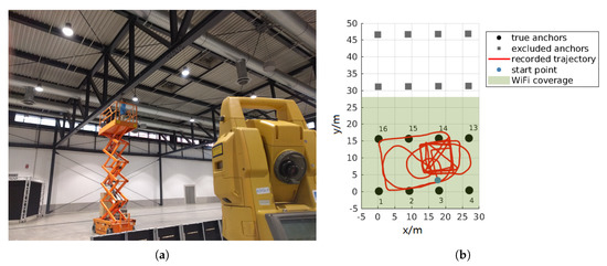 We installed 16 anchors in the commercial exhibition hall “Halle 3” of Messe Freiburg at the bottom of the steel girders at a height of , as shown in Figure 17a. The smartphone requires Wi-Fi connectivity to synchronize the IMU and ASSIST. Due to the limited Wi-Fi coverage, we can only calibrate eight of the anchors. Figure 17b visualizes the anchor positions and an exemplary recorded trajectory from our experiment.