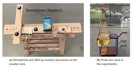 We use a HTC One smartphone for both ASSIST and IMU tracking. The smartphone is fixed to a wooden support rack along with the motion capturing (MoCap) markers, and this is shown in Figure 18a. We align the smartphone to the midpoint between the rear wheels with the y-axis of IMU perpendicular to the rear axle. Moreover, we fix it horizontally with its screen facing upwards. As a result, the speaker, which is located above the top of the device’s screen, is suspended in air. This is done to roughly mimic the smartphone being held in front of your chest while moving and to reduce offset errors. This set-up is then fixed to a push-cart as shown in Figure 18b, which we slowly moved through the experimental areas. The cart has two freely rotating front wheels and two fixed-heading rear wheels, known as an Ackermann steering geometry, which is common for wheeled vehicles [28]. All the wheels are nonholonomic which prevent the side slipping. The heading direction of the vehicle’s body is always perpendicular to the rear axle [28], i.e., the moving direction is perpendicular to the rear axle.