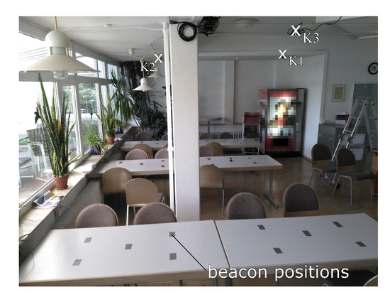 In order to test the capability of an artificial neural network to locate the target with unknown anchor positions and a realistic environment, we perform a real experiment in a cafeteria (see Figure 19). We mount seven anchors on the ceiling. Then, we place a sender in 29 different zones on tables, that are marked by tape. The received timestamps at each zone and the zone number serve as the training set for the machine learning algorithms.