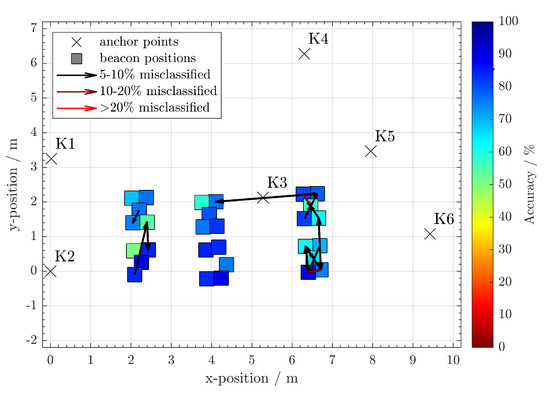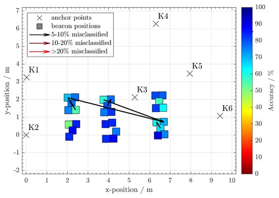 Approximate positions of the clustered beacon positions and the most clear misclassifications using a neural network. The colors of the beacon clusters indicate their accuracy of correct assignments.