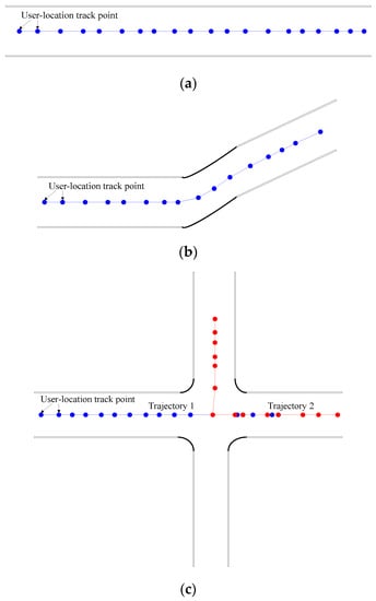 In general, the underground tunnel has a special spatial structure. The width and length of the tunnel are not the same order of magnitude. The length of the tunnel is several hundred meters, even several kilometers, but the width of the tunnel is only a few meters. Therefore, a miner’s movement in the tunnel width direction can practically be ignored. A sketch of a user-location track is shown in Figure 2. It is assumed that the user-location track points are always recorded at the middle position in the direction of tunnel width on the 2-D plane.