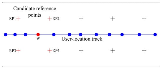 To reduce the influence of accumulated error on the generation of radio fingerprint samples, it is necessary to select PB reference points closest to the user-location track point for the best reference point matching. For example, the relative position between the user-location track and reference point is shown in Figure 3. If PB = 4, RP1, RP2, RP3, and RP4 will be the candidate reference points of for user-location track point W. Because the RP1, RP2, RP3, and RP4 are the four nearest reference points to W, PB can also be regarded as the dimension of particle solution space in QPSO. The value of is determined by the QPSO optimization process between the RSSI of user-location track points and the radio fingerprint calibration samples of reference points in each dimension.