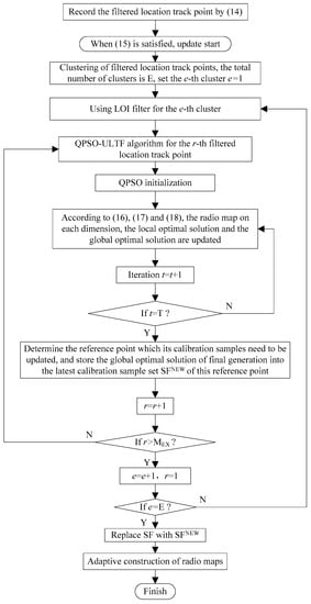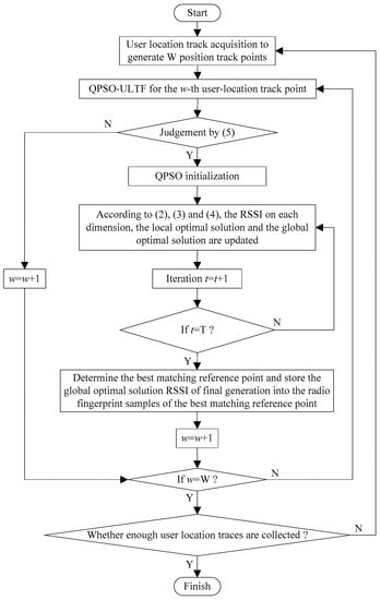 The flowchart of the adaptive construction method of radio fingerprint database based on QPSO–ULTF is shown in Figure 4.