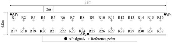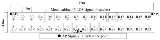In order to analyze the change in RSS distribution between in and the calibration samples of the candidate reference points, eight metal cabinets, each with a length of 2.2 m, a width of 0.5 m, and a height of 2.1 m are placed in the tunnel, as shown in Figure 10.