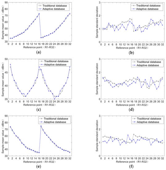 Comparison of radio fingerprint samples statistical distribution between the adaptive radio fingerprint database and the traditional radio fingerprint database: (a) mean value of ; (b) standard deviation of ; (c) mean value of ; (d) standard deviation of ; (e) mean value of ; (f) standard deviation of .