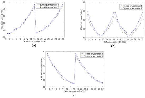 Received signal strength (RSS) mean value comparison of each reference point when tunnel environments changed: (a) mean value of ; (b) mean value of ; (c) mean value of .