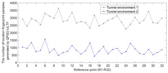 According to the analysis in Section 4.2.1, the RSS distribution at most reference points will change when the location environments change. There will be a big difference between the in feedback data of user-location track points and the RSS mean values of calibration samples of candidate reference points. Most of the feedback data of user-location track points are not satisfied with Equation (5). We can observe that the number of user-location track points have filtered out what they are not satisfied with Equation (5) in experiments. Figure 12 gives the number of radio fingerprint samples generated by the QPSO–ULTF at each reference point in the two tunnel environments. The experimental data collection process is similar to the process explained in Section 4.1.2. The adaptive radio fingerprint database is constructed by 3000 user-location tracks of three miners. The calibration samples of each reference point are collected in tunnel Environment 1. The comparison between the number of user-location track points and the number of user-location track points that do not satisfied with Equation (5) is shown in Figure 13. In Environment 1,126,742 location track points are recorded, and 91,031 radio fingerprint samples are generated adaptively from 32 reference points. In Environment 2, 122,945 location track points are recorded, and 27,036 radio fingerprint samples are generated adaptively from 32 reference points. The comparison results in Figure 13 show that 77% of the location track points are filtered out because they do not meet the criteria of the QPSO–ULTF operation after the tunnel environment changed. Therefore, considering that the change in RSS distribution at reference point caused by the change of tunnel environment is generally happened. A scale threshold can be set as a criterion to determine whether the location environment has changed.