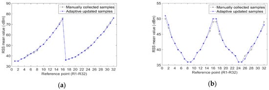 Figure 15 shows the RSS mean value comparison results between 1000 groups of RSSI collected manually and RSSI generated by adaptive update at each reference point in the tunnel environment, as shown in Figure 10. After updating, the mean value of RSS calibration samples at each reference point is basically the same as the mean value of manually collected RSSI. It can be inferred that the adaptive updating of the radio fingerprint database based on QPSO–ULTF can achieve the better adaptive correction of RSS distribution at each reference point. The specific positioning experiments will be discussed in Section 4.