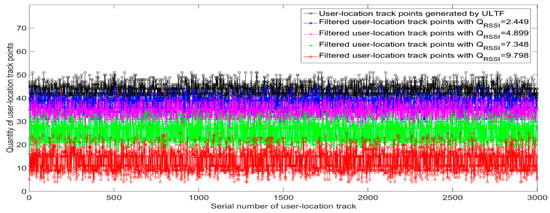 Figure 16 shows the comparison of the quantity of filtered user-location track points in all user-location tracks with different values of . The total number of filtered user-location track points is 11,1491, 95,050, 75,231, and 39,940 when is 2.449,4.899, 7.348, and 9.798, respectively. When is large, only 32% of user-location track points are filtered out even if the positioning environment has changed. This will lead to a situation in which the system cannot accurately determine whether the tunnel environment is indeed changed. When is small, nearly all the user-location track points are judged to be filtered out, which causes an increase in the load of the positioning system. In practical applications, it is necessary to choose a reasonable value. This should not only ensure that the observing sensitivity of underground positioning environment has changed, but should also consider the working efficiency of the positioning system. At the same time, it also should take into account the number of user-location track points filtered by the QPSO–ULTF when the radio fingerprint database is updated adaptively.
