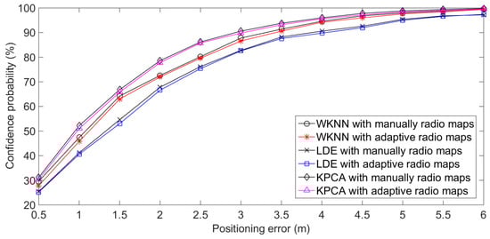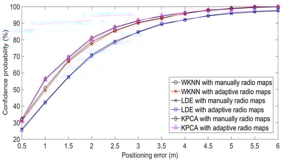 Experiment 1 is aimed at verifying the positioning performance of an adaptive radio fingerprint database. The environment of this experimental tunnel is shown in Figure 5 and Figure 8. There are three AP signals and 32 reference points in the positioning tunnel. The two databases used in this experiment are the traditional radio fingerprint database constructed manually in Section 4.1.2 and the database constructed adaptively. The miners carry out 500 positioning tests for each of these two databases. In order to achieve comparable results, Weight K-Nearest Neighbors (WKNN) [18], Local Discriminant Embedding (LDE) [19,20], and Kernel Principal Component Analysis (KPCA) [21,22] are used to doing the positioning test.