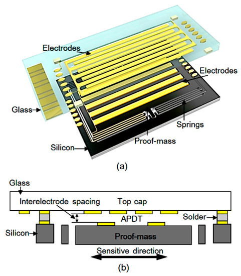 Recently, high-precision MEMS accelerometers are emerging for applications in precision gravity measurements [1], seismic monitoring [2], resource exploration [3] and inertial navigations [4], showing advantages in terms of both the size and the cost [5]. Specially, MEMS accelerometers using an area-variable periodic-electrode displacement transducer (APDT) are some of the most widely used MEMS accelerometers, due to their good linearity, high sensitivity and mature back-end electronics [5,6,7,8].