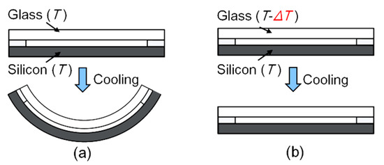 According to Equation (6), the bonding-induced warpage and stress can be eliminated theoretically, as shown in Figure 2b.