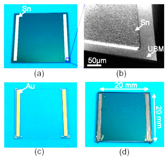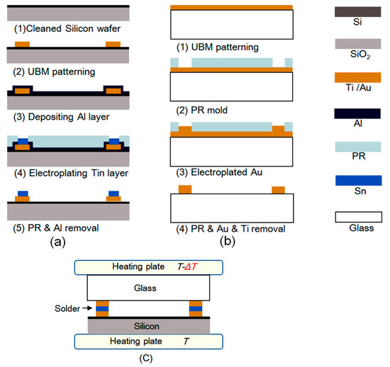 Five samples with various temperature differences applied to the top cap and the spring-mass structure were bonded to validate the proposed method. The process flow started from a four-inch n-type silicon wafer with a thickness of 500 μm. A 200-nm-thick SiO2 layer was deposited on the surface (Figure 3). Firstly, the wafer was successively cleaned with acetone and isopropanol. Then, a patterned under-bump metal (UBM) consistings of a 40-nm-thick titanium (Ti) and a 200-nm-thick gold (Au) was deposited with electron beam evaporation followed by a lift-off process. Afterwards, a 100-nm-thick aluminium (Al) seed layer was deposited as conducting layer for electroplating [24]. Afterwards, a patterned Tin layer with a thickness of 20 μm was electroplated, followed by removing the Photoresist and seed layer by wet etching. The four-inch glass wafer (Borofloat 33) was fabricated by a similar process, except that the electroplated metal was gold with a thickness of 2.5 μm. The processed glass and silicon wafer were sawed into slices by a precision dicing machine (DS620). Finally, the glass slice and the silicon slices were bonded together by reflow soldering.