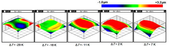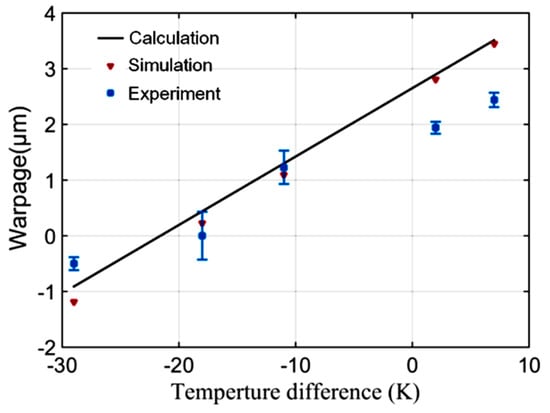 A fabricated sample was shown in Figure 4. The warpage of the samples was measured using a white light scanning profiler (Zygo NewViewTM7100). The surface topography of the samples was highly relevant to the temperature difference of the two bonded slices, as shown in Figure 5. The topography of the top caps had a hump-up tendency when the temperature applied to the top cap increased. The quantitative warpage was shown in Figure 6, which was defined by the height in the center subtracting that on the corner of the top cap’s surface. In order to verify the testing results, calculation results based on Equation (A3) of the Appendix A and the FEA results were used for comparison. The experiment, calculation and simulation results showed the same tendency that the warpage (positive when convex to the silicon and negative when convex to the glass) decreaseds with the enlargement of the glass temperature when the silicon temperature remains unchanged. When the temperature difference was −22 K, the warpage approached zero. The errors between the experimental, calculation and simulation results were within 23%. The experimental warpage was less than that of the calculation and simulation when the bonding warpage was large. The reason was probably the plastic deformation, which was not considered in the calculation and simulation, which would have released partial bonding stress.