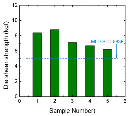 In order to verify the bonding strength of the proposed bonding process, all five samples were tested using a multi-function push-pull tester (XYZTEC @Condor Sigma Lite). Figure 7 shows the measured slice shear strength of the samples. Based on the MIL-STD-883E standards, the bonding strength was required to be greater than 5.0 kgf as the bonding area was 0.07 square inches. Hence the strength of all the samples using the proposed bonding process met the MLD-STD-883E standards.