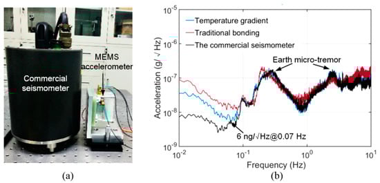 Figure 8 shows the bonded chip and the assembled accelerometer with the circuit. The low-warpage bonding process was applied to the development of a high-precise MEMS accelerometer using an APDT that has been discussed in our previous publications [11]. The design and fabrication were the same as Reference [11], except for the bonding process. Beneficial from the flat surface by applying a proper temperature difference to the glass cap and the spring-mass structure, the interelectrode spacing was able to be controlled precisely. The accelerometer using the proposed bonding process had an interelectrode spacing of 8 μm, which was approximately two-thirds of that in accelerometer bonded with a uniform temperature. In order to calibrate the self-noise, the accelerometer bonded by the proposed strategy and another accelerometer bonded by a traditional process were tested statically in our cave laboratory with a quiet environment. A commercial seismometer (CMG-3EPS, GURALP) was installed adjacent to our accelerometers as a reference, as shown in Figure 9a. The results shows that the MEMS accelerometer bonded by the proposed strategy obtained an ultra-low self-noise of 6 ng/√Hz @ 0.07 Hz, which was two times lower than that of the accelerometer bonded using a uniform temperature, as shown in Figure 9b. The MEMS accelerometer is one of the most sensitive MEMS accelerometer in the world, as shown in Table 2. It is worth emphasizing that there is no need for addition mechanical structures, metal films or process steps for the proposed bonding strategy, which shows great prospect in industrial applications compared with those methods introduced in Section 1.