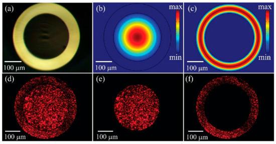 (a) Microscopic image of the cross section of the capillary; (b) fundamental mode guided by the capillary core; (c) fundamental mode guided by the capillary cladding; (d–f) output of the capillary when HeNe laser beams () are coupled to (d) both of the core and cladding, (e) only the hollow core, and (f) only the cladding.