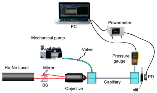 Schematic of the proposed capillary sensor is demonstrated in Figure 2. A He-Ne laser (HNL020LB, Thorlabs Inc, Newton, USA) with a wavelength of 632.8 nm and an output power of 1 mW is split into two beams by a cubic beam splitter. Using a 10 × microscopic objective, one beam is coupled directly into the hollow core of a borosilicate capillary (length: 10 cm), while the other beam is firstly reflected by a mirror to propagate virtually parallel to its counterpart and then coupled into the capillary cladding by the same objective. The input end of the capillary sealed in the fluidic block is placed approximately 6.14 mm (working distance of the objective) away behind the objective. The core-guided modes and cladding modes are excited and propagate independently in the capillary waveguide. Here, we would like to note that splitting the laser into two beams for the capillary coupling is not mandatory. By using an objective, one could couple a single laser beam onto the interface between the cladding and the core of a capillary. Accordingly, both cladding modes and core modes could be excited. However, in this route, the laser power attributed to the cladding modes and core modes is sensitive to the coupling condition, which is prone to be affected by surrounding mechanical vibrations. We, therefore, choose to split the laser into two beams and couple the beams onto the cladding and the core, respectively. Due to the relatively large diameter (thickness) of the core and cladding, coupling of the laser beams thereof is facile and less sensitive to environmental vibrations. At the output end, transmitted lights from the core modes and cladding modes interfere, and thus produce an interferogram that is then captured by a CMOS camera. Both ends of the capillary are sealed into the 3D-printed fluidic blocks which enable the air to stream through the capillary rapidly. A transparent window attached on the block enables convenient optical coupling of laser beam into the core and cladding. A mechanical vacuum pump is connected to the block accommodating the capillary input end, and the block holding the other end of the capillary is connected to a digital vacuum gauge with a resolution of 1 hPa (102 Pa). The correlation between the pressure and refractive index of air can be expressed as [12]