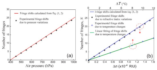 (a) Fringe shifts in response to variations in air pressure in the capillary core; (b) fringe shifts in response to variations in the refractive index of gas filled in the capillary as well as variations in surrounding temperatures.