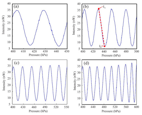 In Figure 5a–d, we present the recorded intensity variation while the air pressure inside the capillary varies by 50, 100, 150, and 200 hPa. The intensity oscillations in Figure 5 are a direct consequence of the fringe shifts caused by the changes of the air pressure and thus the refractive index of the capillary core. Therefore, the changes of the refractive index could be quantified by counting the number of the periods in the intensity variation. Note that there is also a good repeatability of the sensor. Particularly, the results in Figure 5a–c look simply like cutouts of Figure 5d, although these four measurements are completely independent.