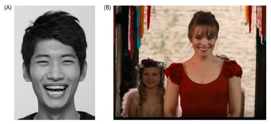 Stimuli used in posed and spontaneous facial emotion task. (A) Posed happy smiles. (B) Spontaneous happy smiles (film clip was taken from “About Time” movie clip).