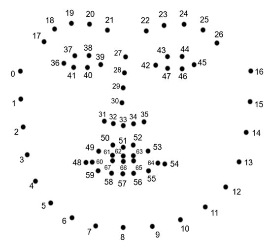 The 3D facial landmark intensity estimation was measured by using each displacement between the landmark of the neutral expressions and the landmark of the smile expressions. The 68 point facial landmark annotations used in this study are represented in Figure 2. The 3D facial landmarks were extracted using convolutional experts constrained local model (CE-CLM) provided by OpenFace2.0 []. The performance of CE-CLM in OpenFace toolkit was measured on publicly available datasets such as 300-W [], Menpo []. The size normalized median landmark error was used as the evaluation metric(ε), as shown in Equation (1).