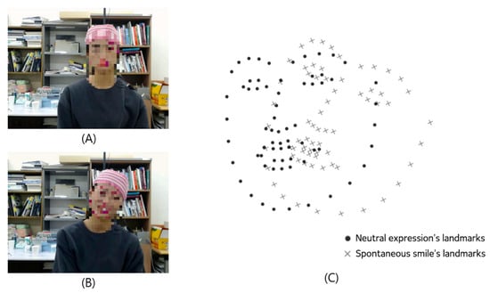 The example of alignment problem between facial landmarks in neutral and smile expression: (A) head position and angle during neutral expression, (B) head position and angle during smile expression, (C) example of misalignment problem between two facial landmarks.